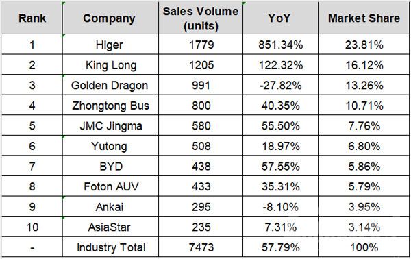 Among the top ten manufacturers, eight posted year-on-year growth. Higer Bus led with the highest growth rate of 851.34%, and Xiamen King Long more than doubled its exports with a 122.32% increase.