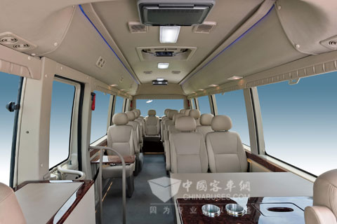 Inside the bus lies the foldable computer desk and wide business desk by the door. Luxury seats and air purifying system offer the comfortable environment to the passengers.
