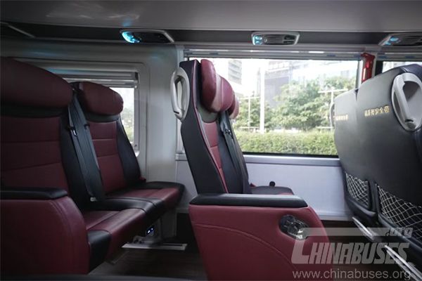 Within the 12-meter coach, seating is limited to just 40–44 business-class-style seats, each reclining up to 45° and fitted with adjustable headrests. The configuration provides legroom far exceeding that of standard coaches. Every seat comes equipped with USB-A/C ports and 220 V sockets, while onboard amenities include 5G Wi-Fi, an overhead 4K display, and a premium audio system. A 40-liter refrigerator keeps beverages chilled, and a factory-installed professional first-aid kit enhances passenger safety.